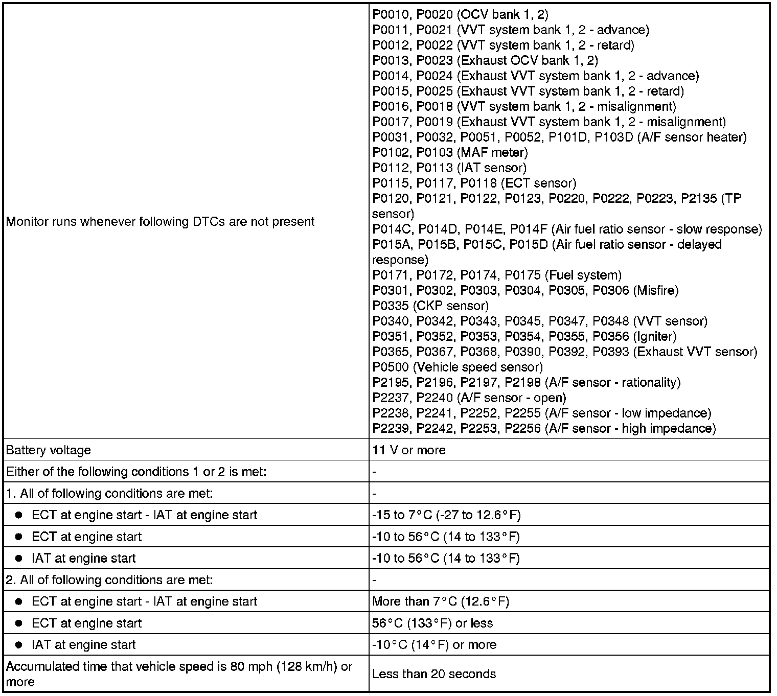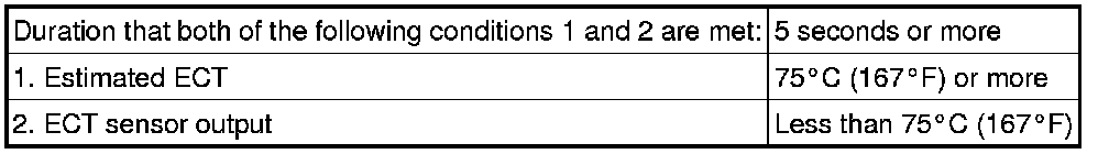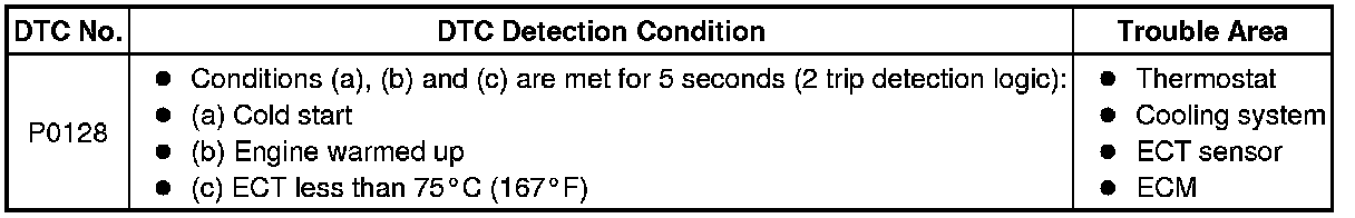 This DTC is set when the Engine Coolant Temperature (ECT) does not reach 75°C (167°F) despite sufficient engine warm-up time.