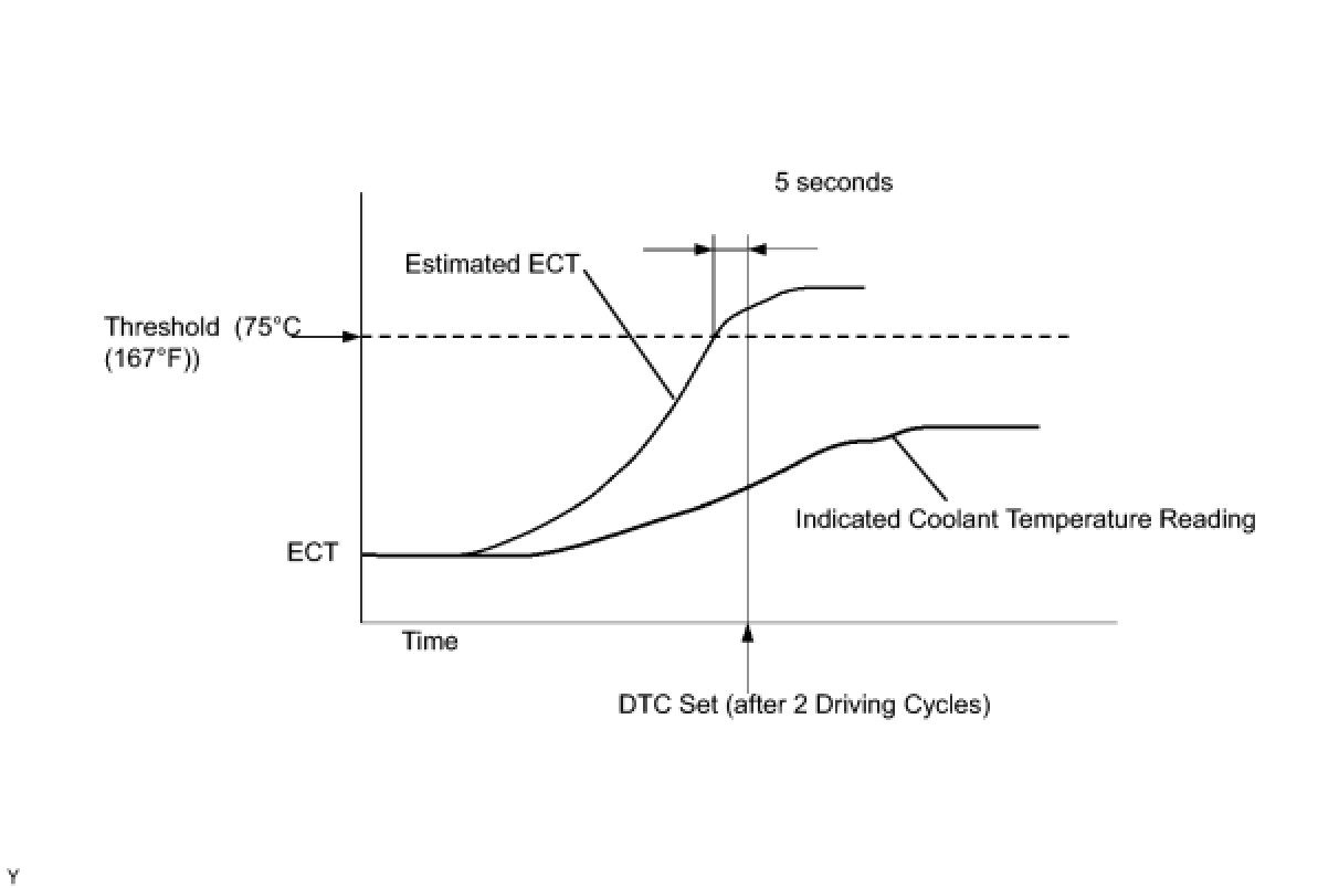 The ECM estimates the ECT based on the starting temperature, engine loads, and engine speeds. The ECM then compares the estimated temperature with the actual ECT. When the estimated ECT reaches 75°C (167°F), the ECM checks the actual ECT. If the actual ECT is less than 75°C (167°F), the ECM interprets this as a malfunction in the thermostat or the engine cooling system and sets the DTC.