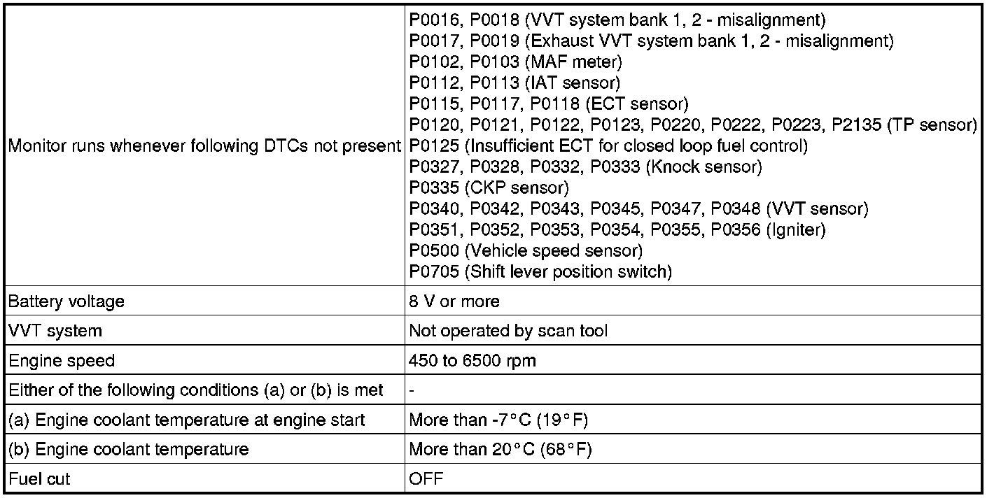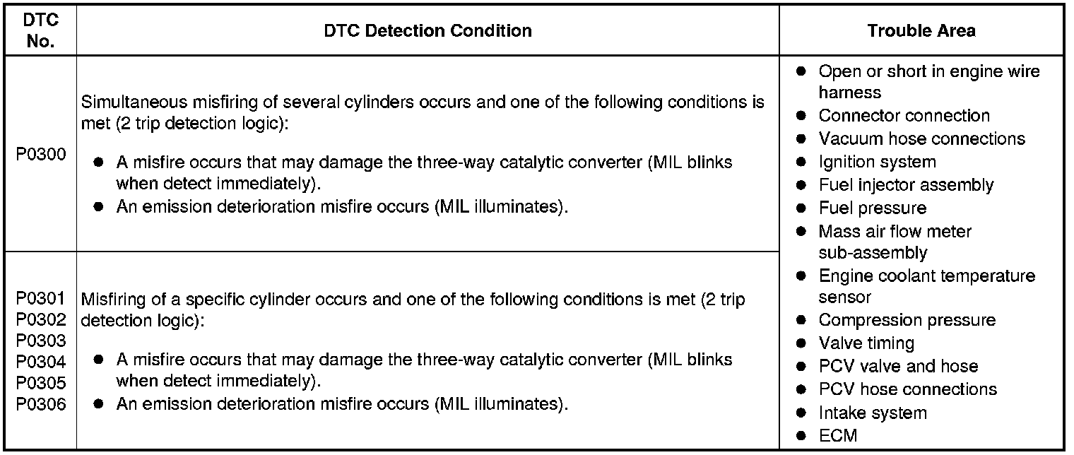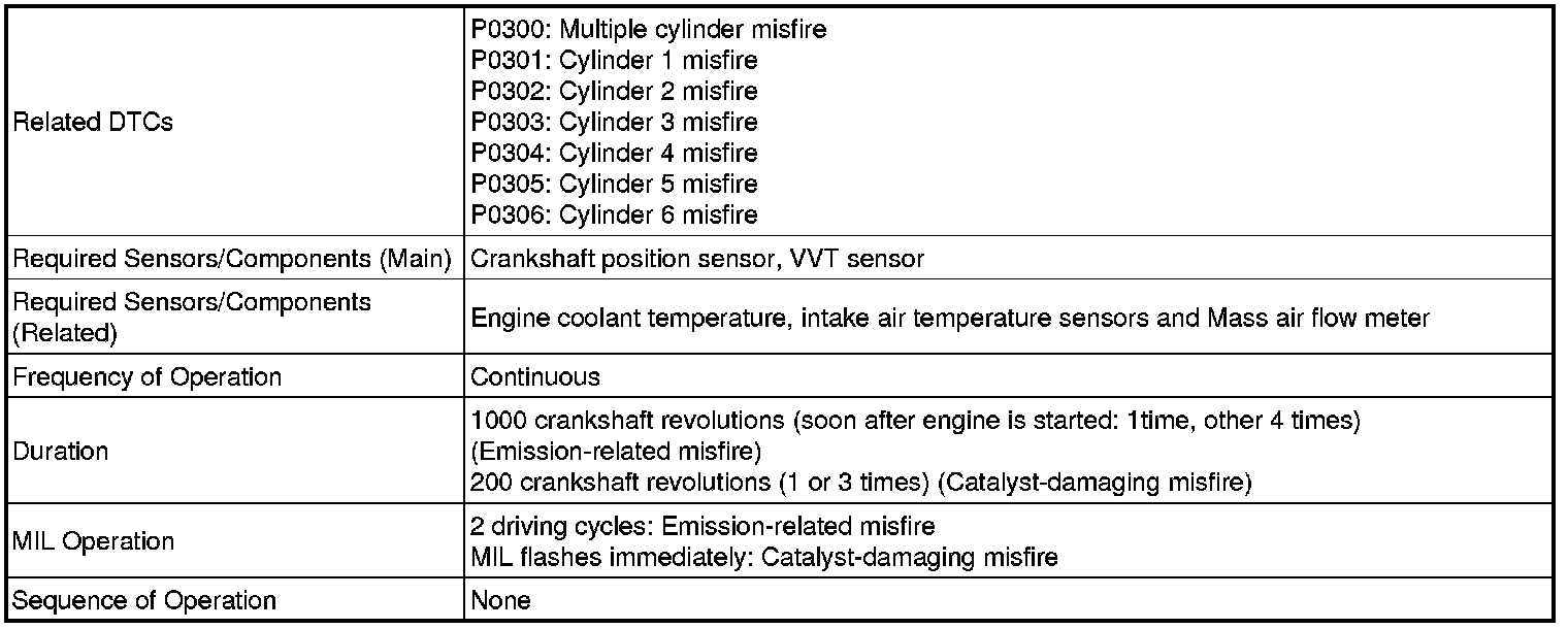 When the engine misfires, high concentrations of hydrocarbons (HC) enter the exhaust gas. Extremely high hydrocarbon concentration levels can cause an increase in exhaust emission levels. Extremely high concentrations of hydrocarbons can also cause increases in the three-way catalytic converter temperature, which may cause damage to the three-way catalytic converter. To prevent this increase in emissions and to limit the possibility of thermal damage, the ECM monitors the misfire count. When the temperature of the three-way catalytic converter reaches the point of thermal degradation, the ECM blinks the MIL. To monitor misfires, the ECM uses both the VVT sensor and the crankshaft position sensor. The VVT sensor is used to identify any misfiring cylinders and the crankshaft position sensor is used to measure variations in the crankshaft rotation speed. Misfires are counted when the crankshaft rotation speed variations exceed predetermined thresholds. If the misfire count exceeds the threshold levels, and could cause emission control system performance deterioration, the ECM illuminates the MIL and stores a DTC.