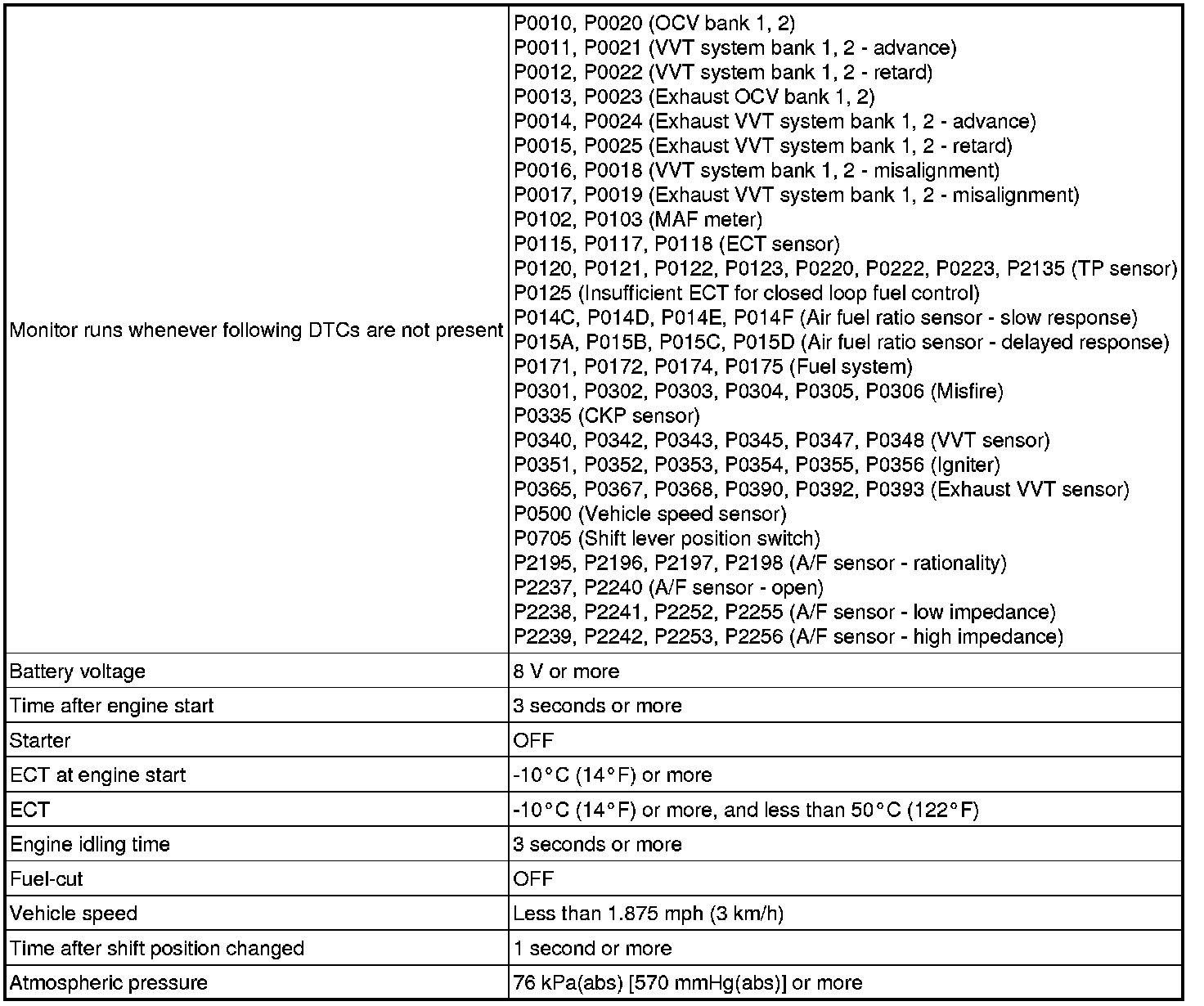 This monitor will run when the engine is started at -10 to 50°C (14 to 122°F) of the engine coolant temperature. The DTC will be set after the engine has been idling for 13 seconds (2 trip detection logic).