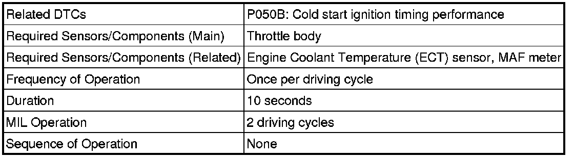 The DTC is designed to monitor the ignition timing at cold start. When the engine is started at an engine coolant temperature of less than 50°C (122°F), the ECM checks the ignition timing during engine idling. If the ignition timing advances beyond the specified level within 10 seconds, the ECM interprets this as a malfunction. The MIL is illuminated and a DTC is stored when the malfunction is detected in consecutive driving cycles (2 trip detection logic).