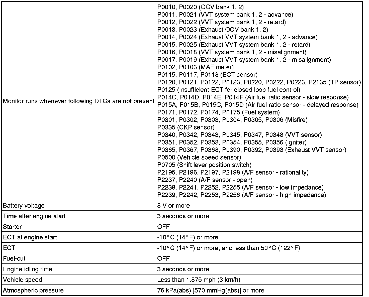 This monitor will run when the engine is started at an engine coolant temperature of -10 to 50°C (14 to 122°F). The DTC is stored after the engine idles for 13 seconds (2 trip detection logic).