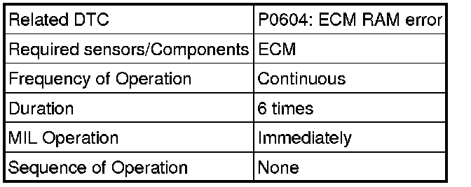 The ECM continuously monitors its internal memory status. This self-check ensures that the ECM is functioning properly. It is diagnosed by internal "mirroring" of the main CPU and sub CPU to detect the Random Access Memory (RAM) errors. If outputs from these CPUs are different and deviate from the standards, the ECM will illuminate the MIL and set a DTC immediately.