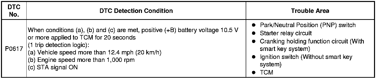 If the TCM detects the Starter Control (STA) signal while the vehicle is being driven, it determines that there is a malfunction in the STA circuit. The TCM then illuminates the MIL and sets the DTC.
