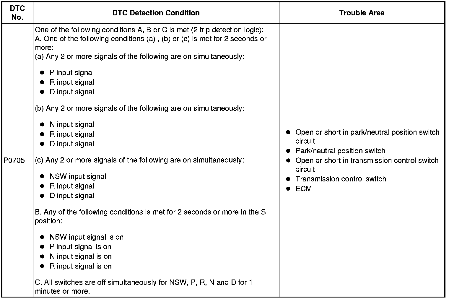 2GR-FE ENGINE CONTROL SYSTEM: SFI SYSTEM: P0705: Transmission Range Sensor Circuit Malfunction (PRNDL Input)