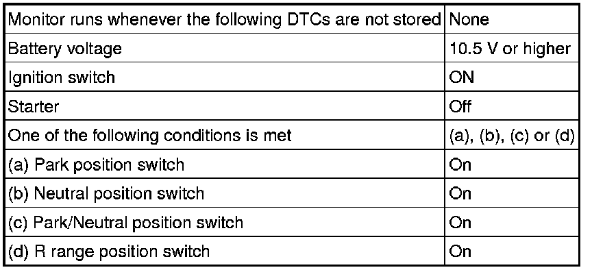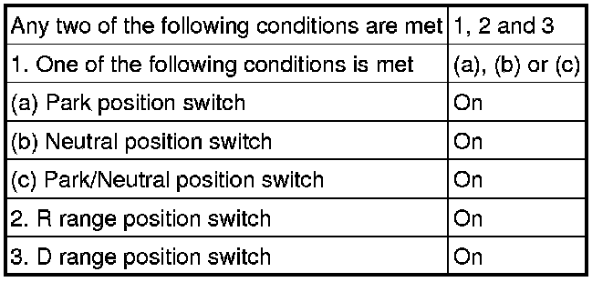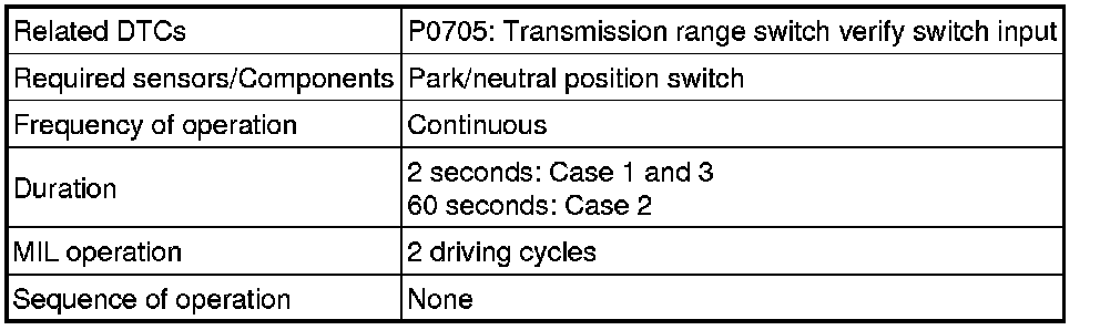 The park/neutral position switch sends a signal to the ECM according to the shift position (P, R, N, D or S). The ECM determines that there is a problem with the switch or related parts if it receives more than 1 position signal simultaneously. The ECM will turn on the MIL and store the DTC.