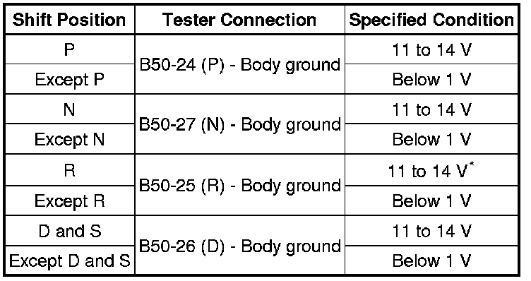 (c) Turn the ignition switch to ON, and measure the voltage according to the value(s) in the table below when the shift lever is moved to each position.