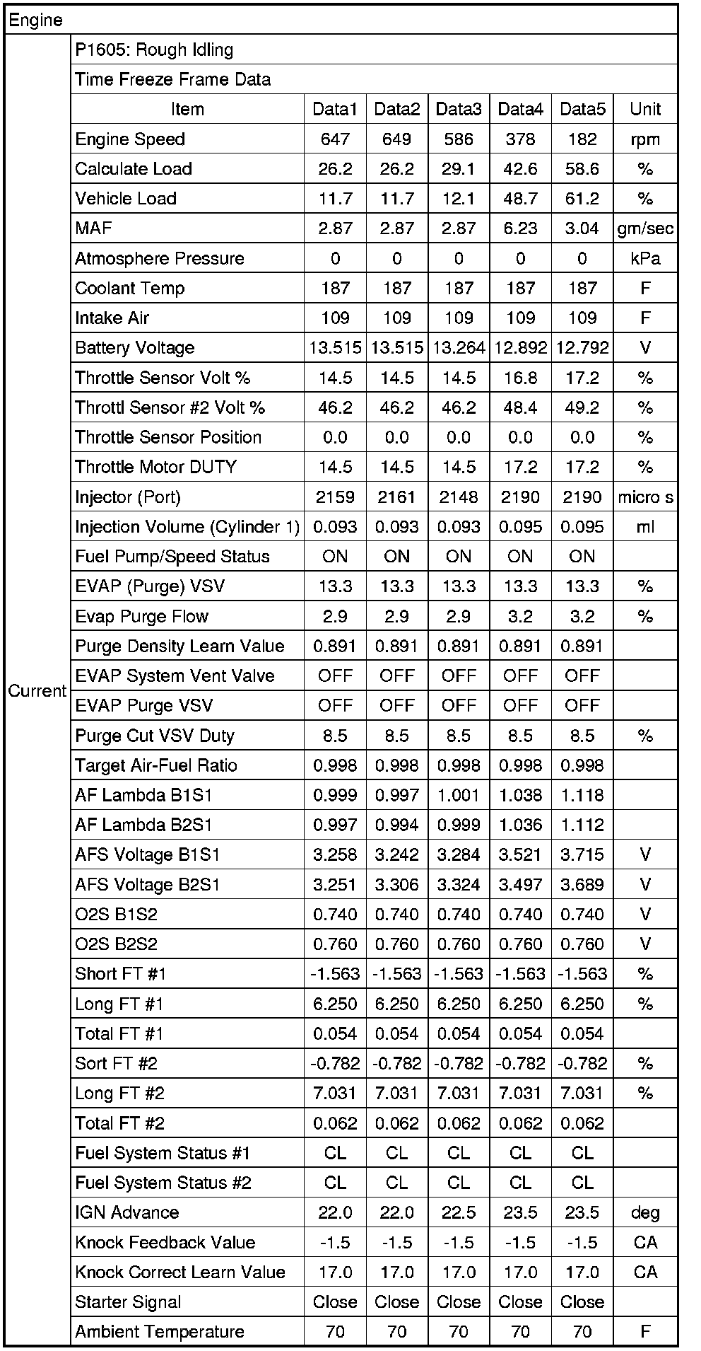 Freeze Frame Data P1605 Rough Idling
