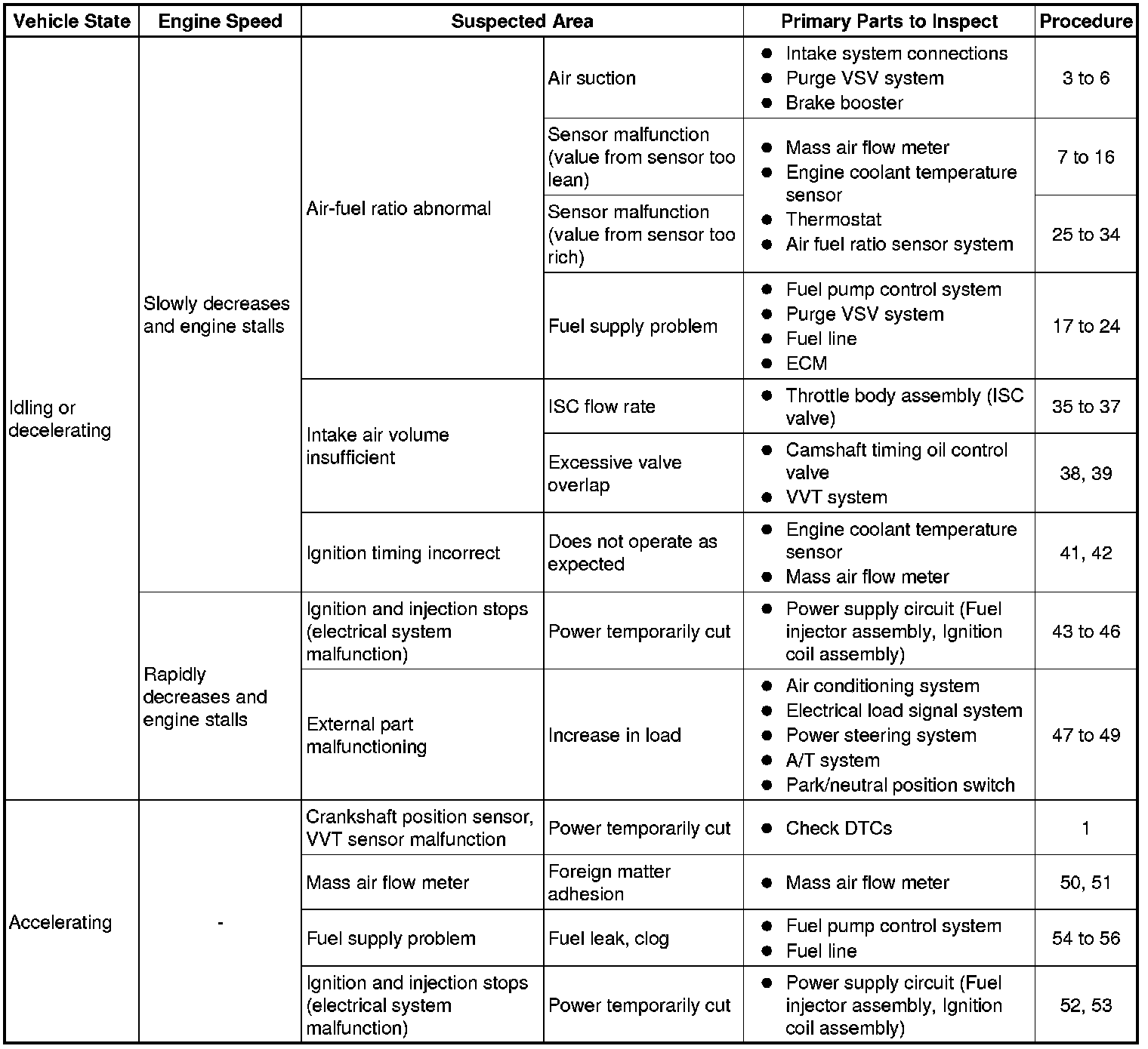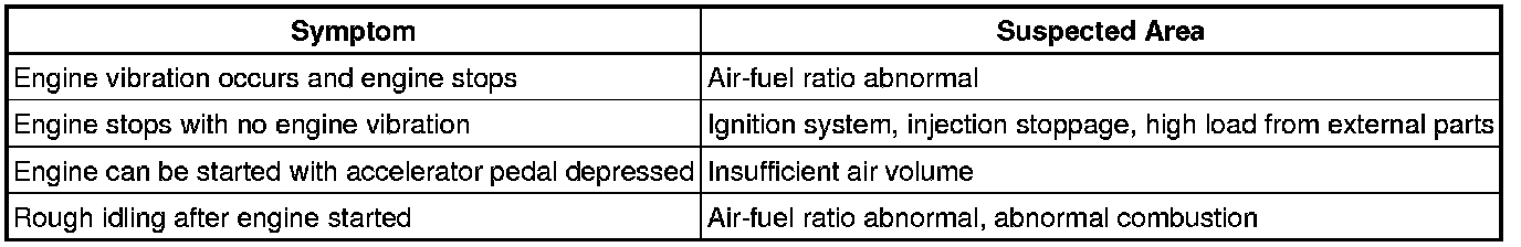 - If the engine stalled when the intake air volume was high (during driving or acceleration), there may be a major malfunction such as continuous misfire due to ignition stoppage, fuel injection stoppage, etc. and the torque drops to zero.