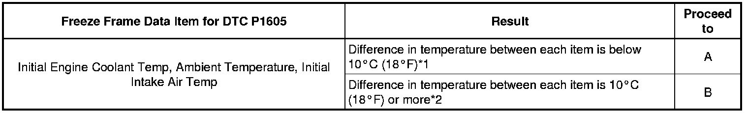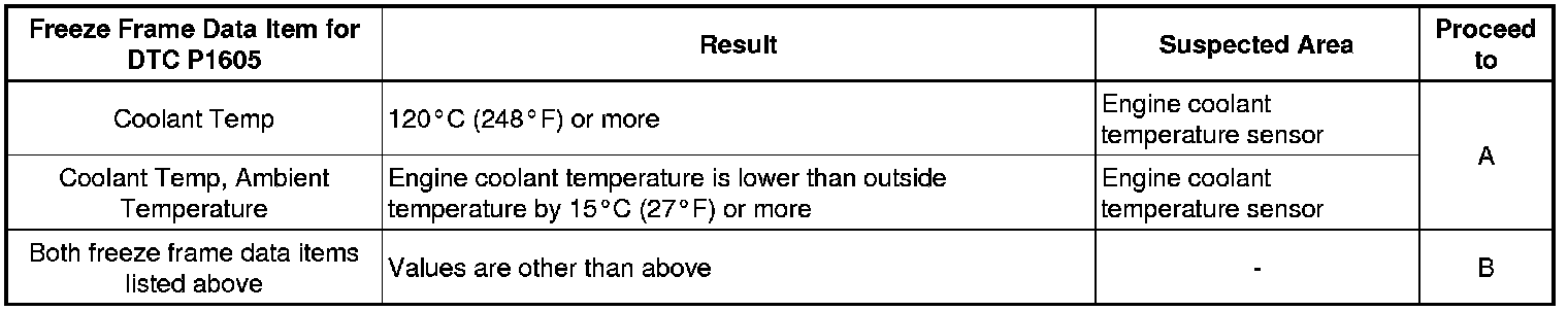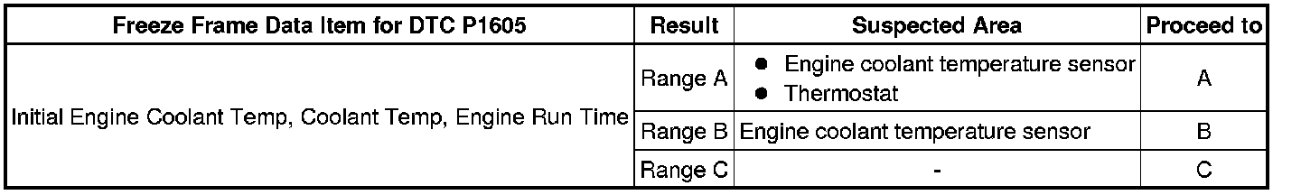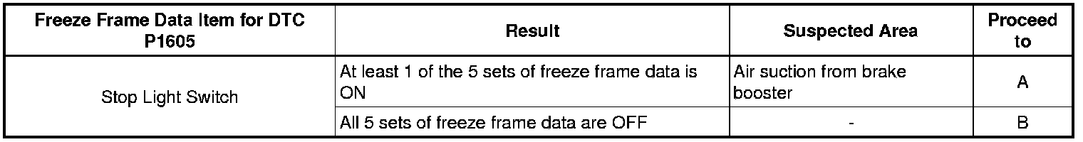 * When DTC P1603 (Engine Stall History) is stored, DTC P1605 (Rough Idling) is also stored. When confirming freeze frame data, check DTC P1605. (The ECM stores DTC P1605 first. Therefore, the 5 sets of freeze frame data can be confirmed through DTC P1605, enabling the technician to obtain more information.)