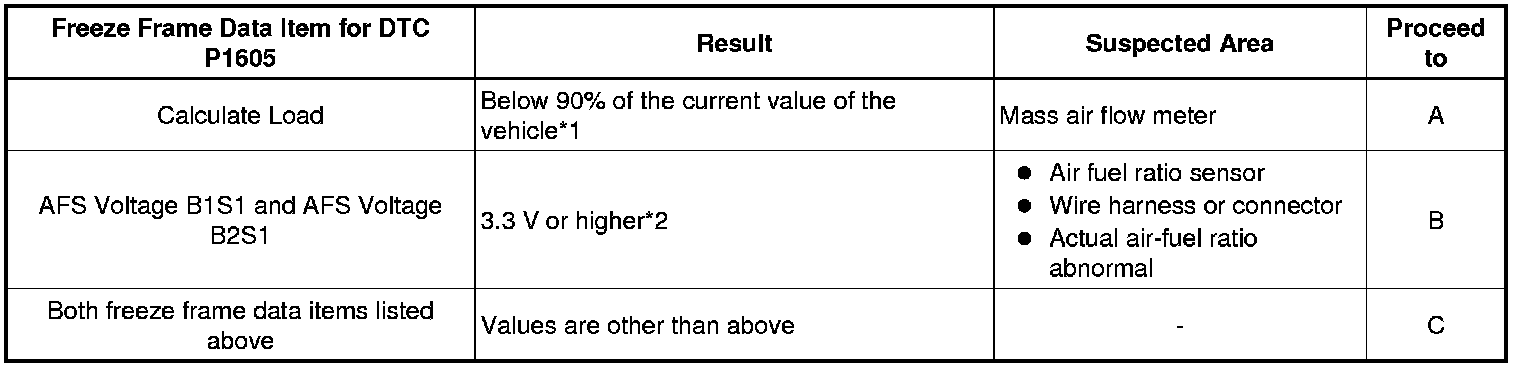 * *1: If the mass air flow meter is malfunctioning and incorrectly measures the pressure to be less than the actual intake manifold pressure, the freeze frame data will show a low engine load value.