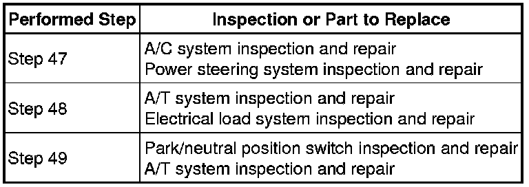 * Even if the results are normal, the electrical load signal system and/or the A/T system may have been malfunctioning. Continue this inspection procedure until step 49, and if there are no problems with other parts, inspect the electrical load system and/or the A/T system (refer to step 57).