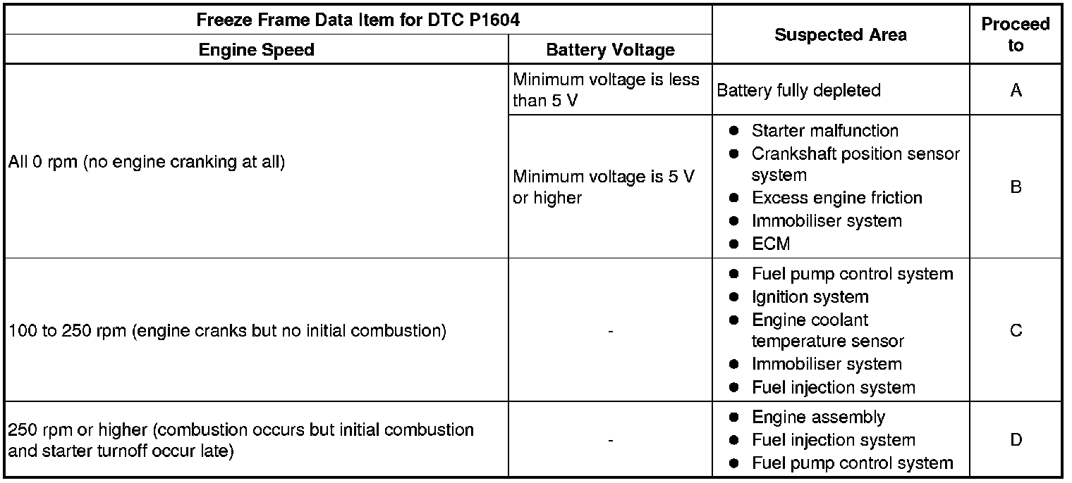 * In contrast to normal malfunction diagnosis for components, circuits and systems, DTC P1604 is used to determine the malfunctioning area from the problem symptoms and freeze frame data when the user mentions problems such as starting difficulty.