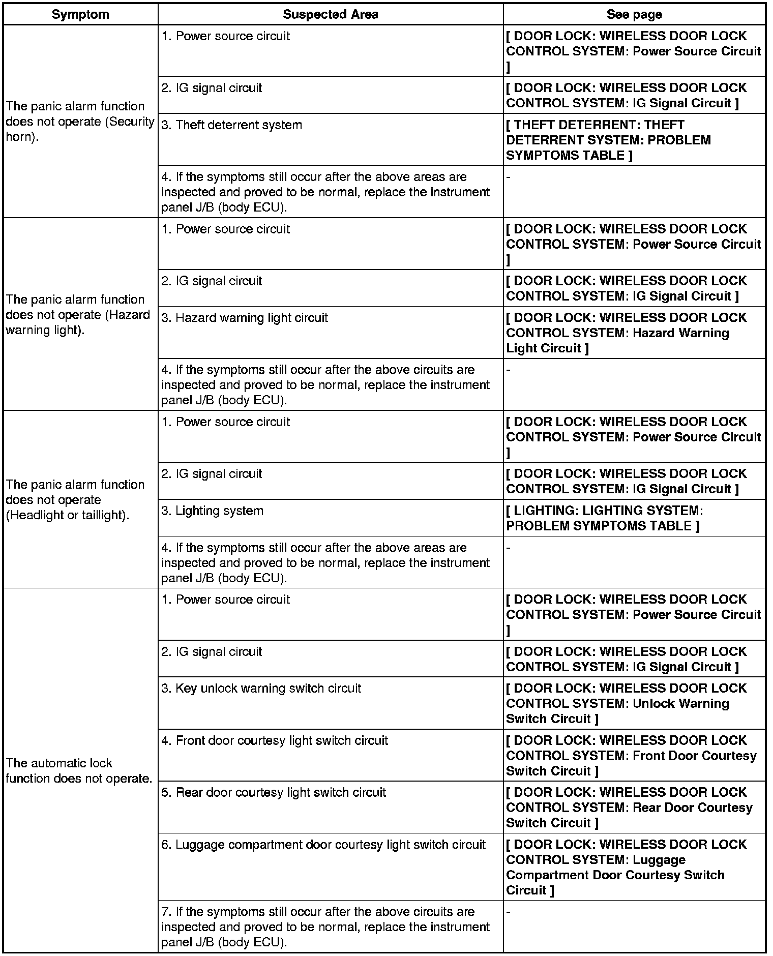 DOOR LOCK: WIRELESS DOOR LOCK CONTROL SYSTEM: PROBLEM SYMPTOMS TABLE