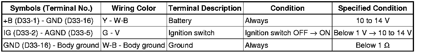 (a) Disconnect the D33 ECU connector, and measure the voltage and resistance between each terminal of the wire harness side connector.