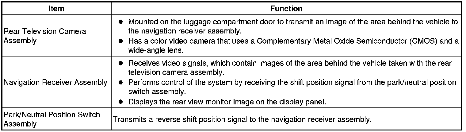 (a) To assist the driver with parking the vehicle by displaying an image of the area behind the vehicle, this system has a television camera mounted on the luggage compartment door. The system displays the image on the navigation receiver assembly.