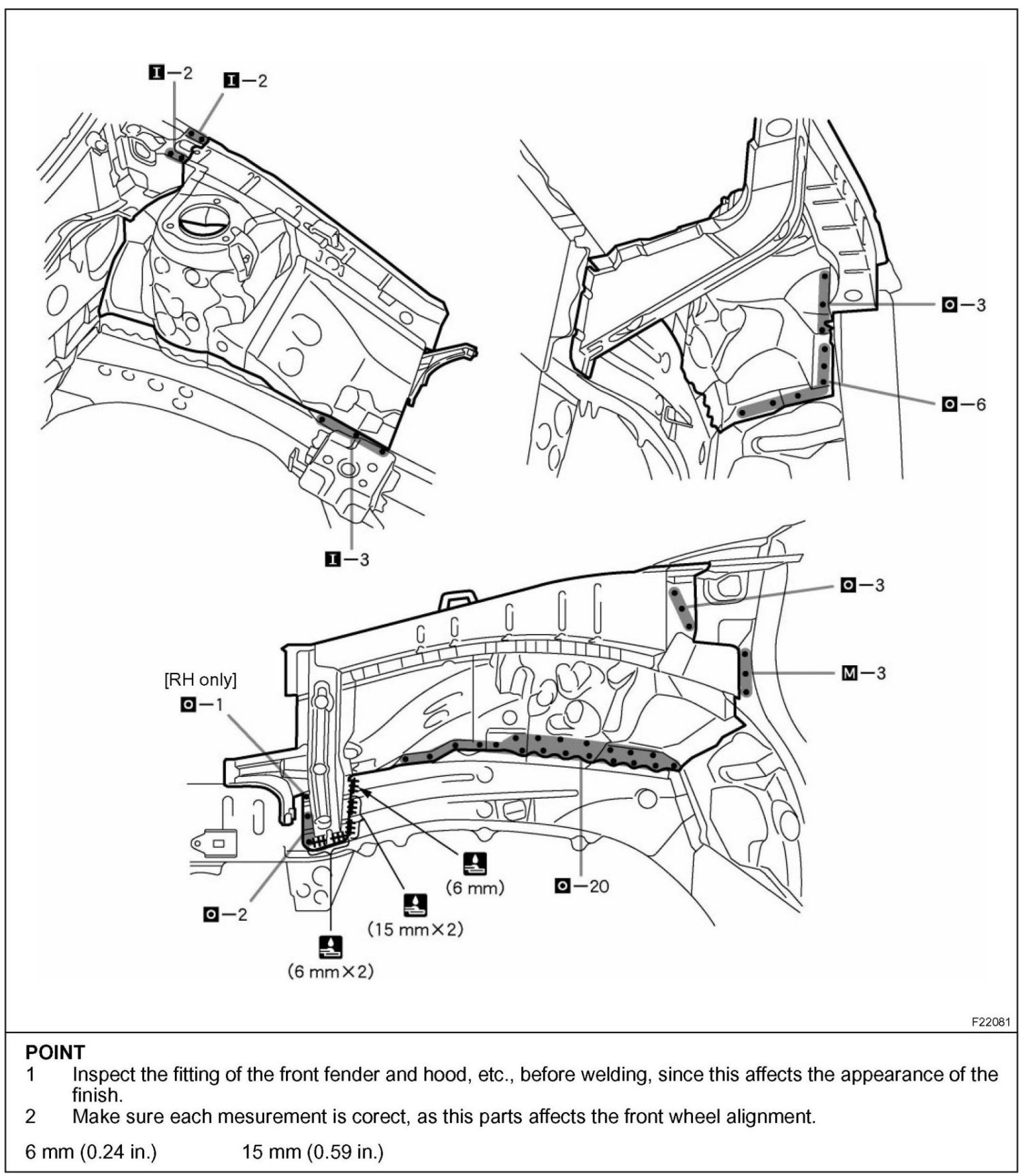 - Inspect the fitting of the related parts around the new parts before welding. This affects the appearance of the finish.