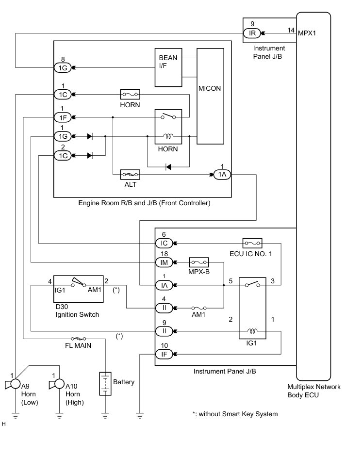 The horn circuit uses BEAN for communication. If there are any malfunctions in this circuit, check for DTCs in the multiplex communication system Reading and Clearing Diagnostic Trouble Codes.