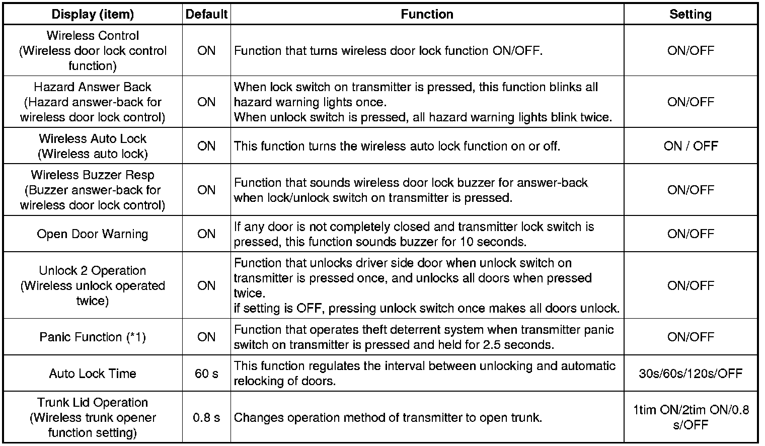 (*1): This function cannot be turned on or off if the security system is turned off.