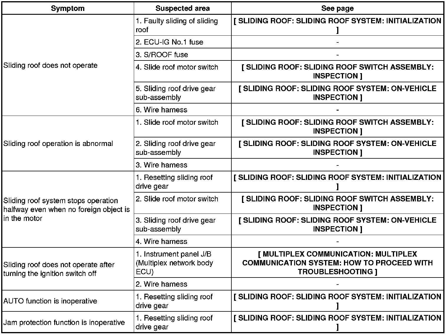 SLIDING ROOF: SLIDING ROOF SYSTEM: PROBLEM SYMPTOMS TABLE