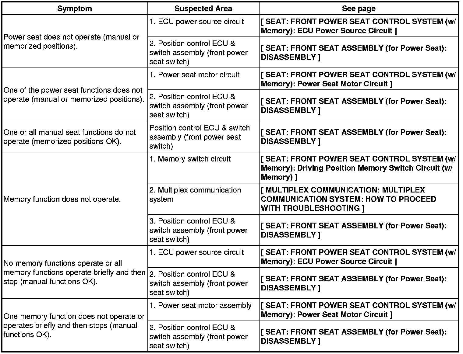 SEAT: FRONT POWER SEAT CONTROL SYSTEM (w/ Memory): PROBLEM SYMPTOMS TABLE