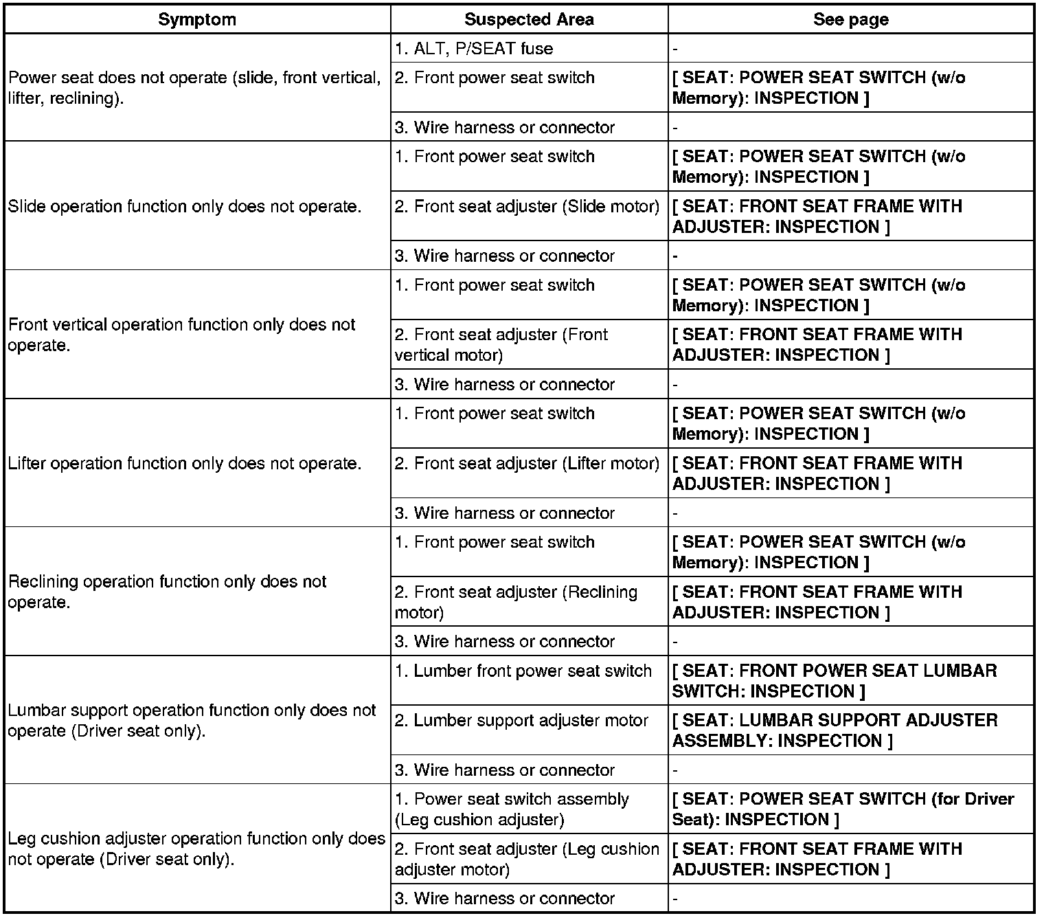 SEAT: FRONT POWER SEAT CONTROL SYSTEM (w/o Memory): PROBLEM SYMPTOMS TABLE