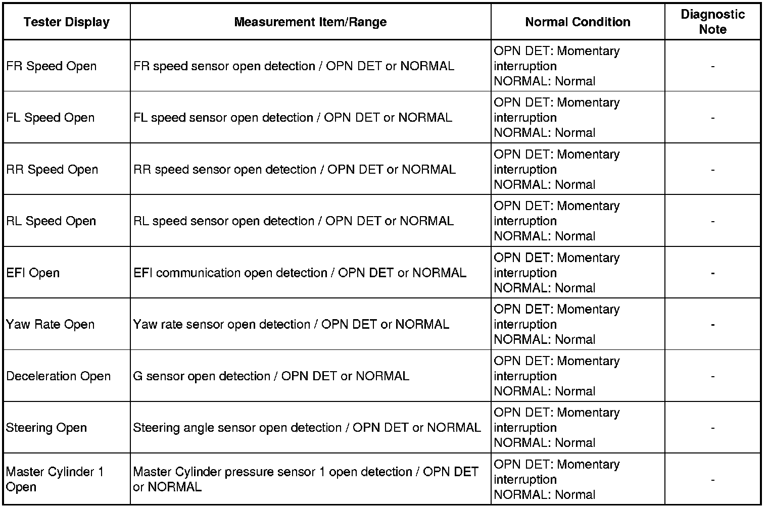 A momentary interruption (open circuit) in the connectors and/or wire harness between the sensors and ECUs can be detected in the ECU data list function of the Techstream.