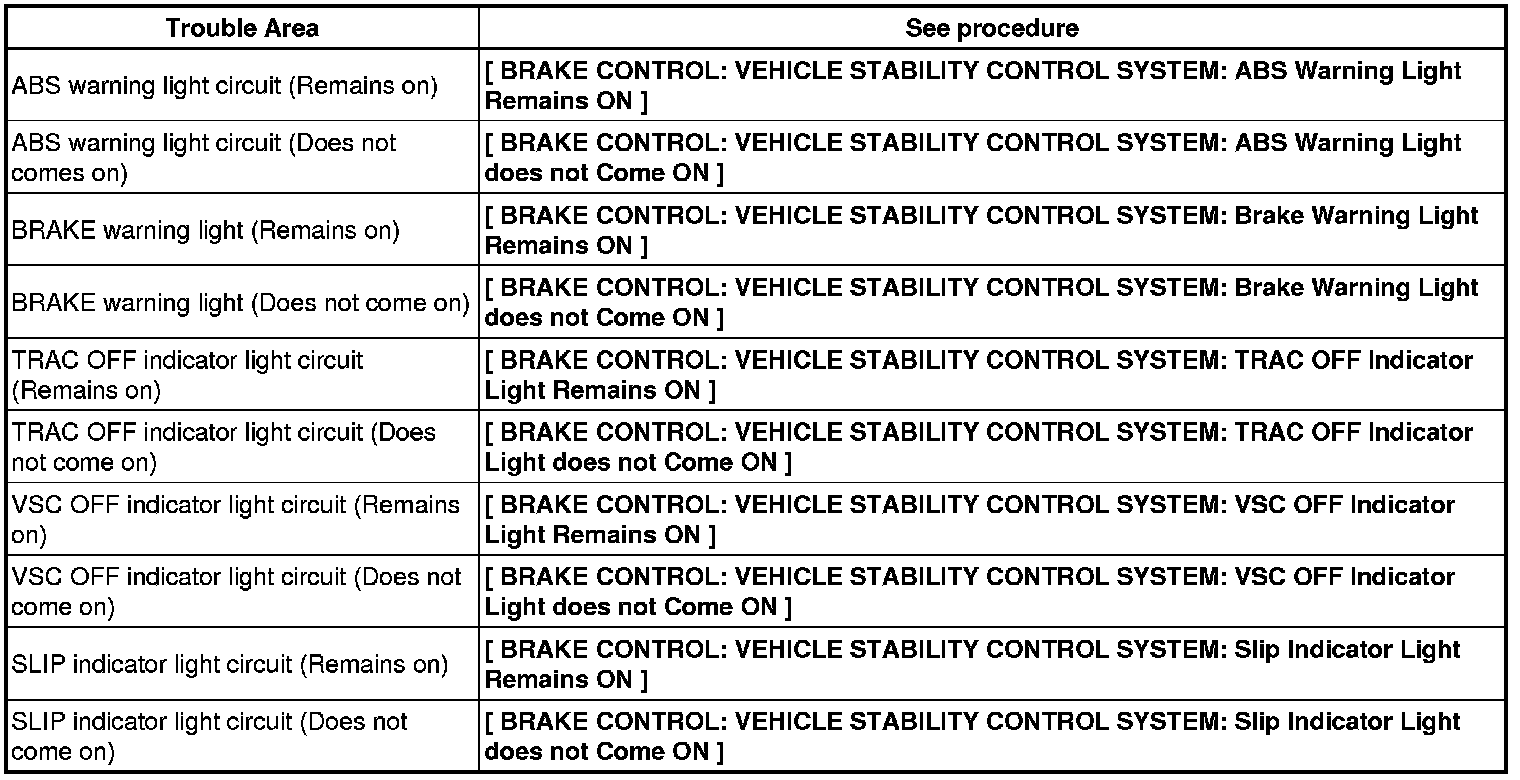 * If the warning light and indicator light initial check result is not normal, proceed to troubleshooting for the ABS warning, BRAKE warning, TRAC OFF indicator, VSC OFF indicator and SLIP indicator light circuits.