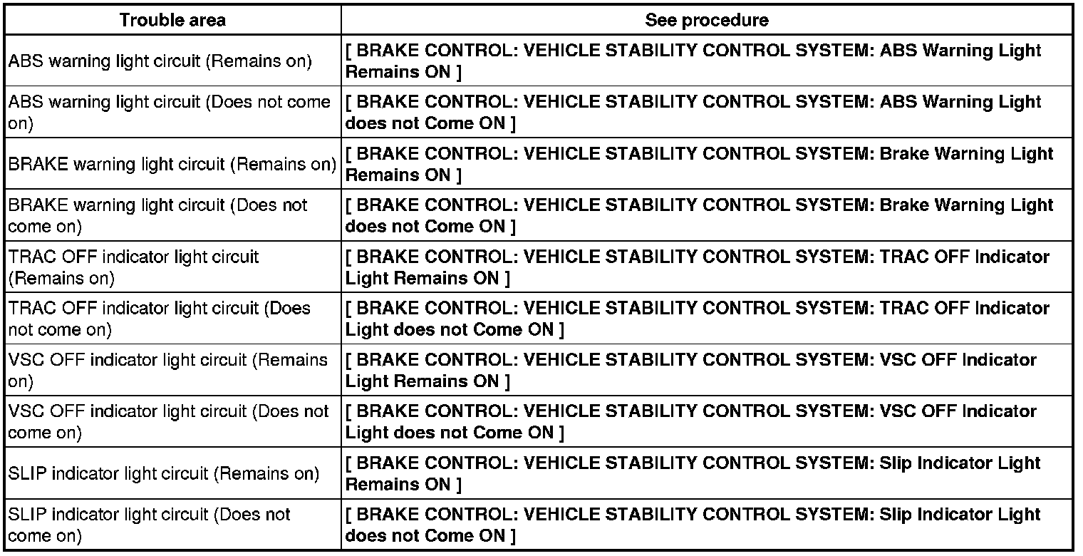If any of the indicators remain on or do not come on, proceed to troubleshooting for the light circuits listed below: