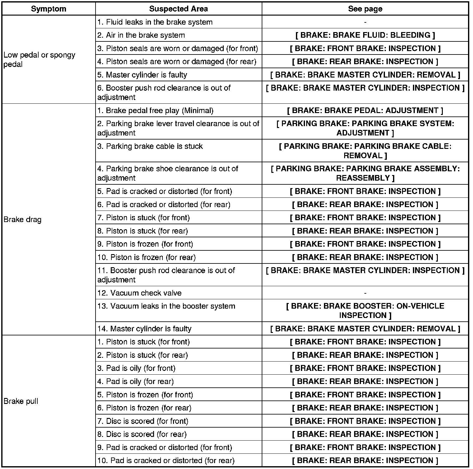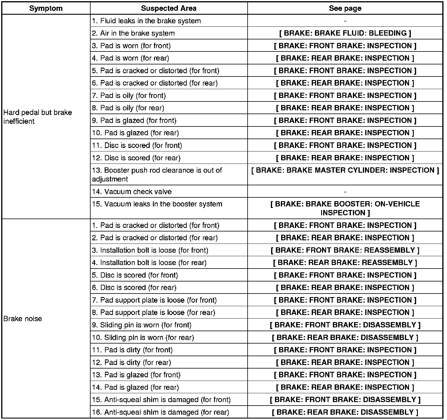 BRAKE: BRAKE SYSTEM: PROBLEM SYMPTOMS TABLE