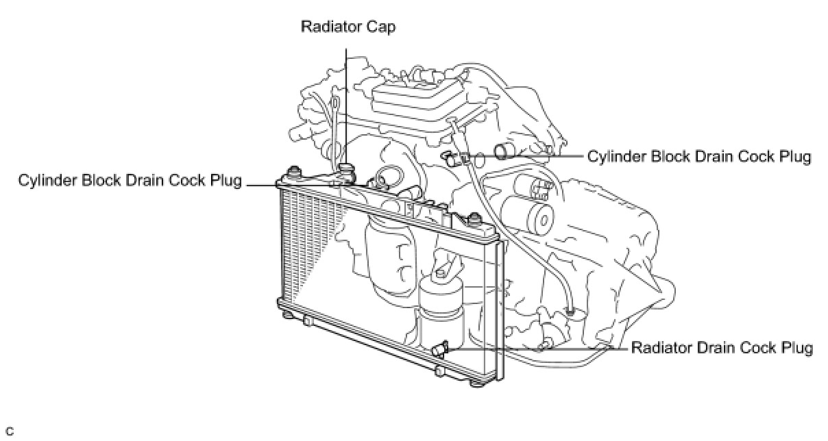 (b) Drain engine coolant by loosening the radiator drain cock plug and the engine's cylinder block drain cock plug.