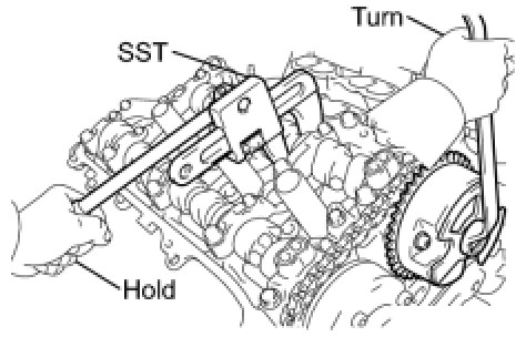 (c) Turn the camshaft timing gear assembly on bank 1 counterclockwise to tighten the chain between the banks.