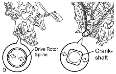 (d) Align the oil pump's drive rotor spline and the crankshaft as shown in the illustration. Install the spline and chain cover to the crankshaft.