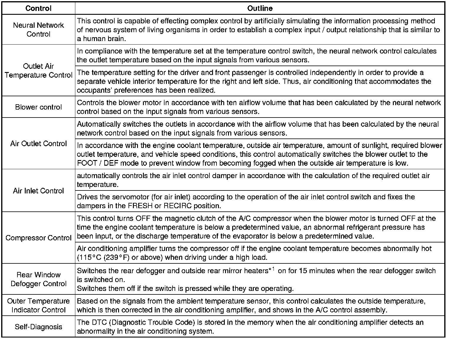 However, because the sensors of a person are rather complex, a given temperature is sensed differently, depending on the environment in which the person is situated. For example, a given amount of solar radiation can feel comfortably warm in a cold climate, or extremely uncomfortable in a hot climate. Therefore, as a technique for effecting a higher level of control, a neural network has been adopted in the automatic air conditioning system. With this technique, the data that has been collected under varying environmental conditions is stored in the ECU, which effects control to provide enhanced air conditioning comfort.