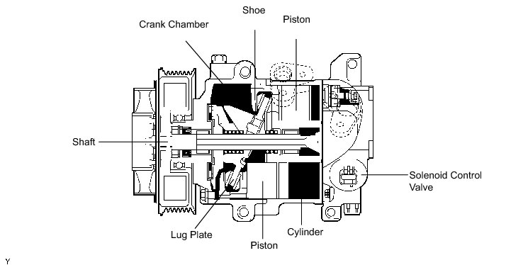 (1) This compressor consists of a shaft, lug plate, piston, shoe, crank, chamber, cylinder, and solenoid control valve.