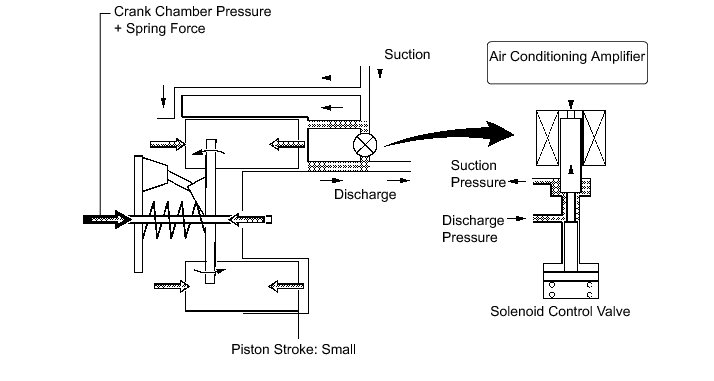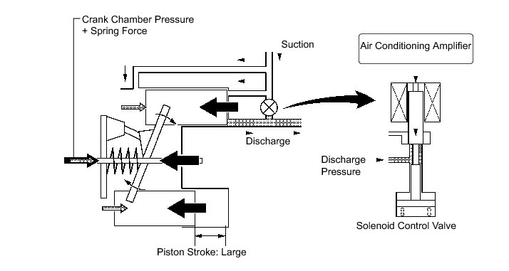 (5) When the solenoid control valve closes (solenoid coil is energized), a difference in pressure is created and the pressure in the crank chamber decreases. Then, the pressure that is applied to the right side of the piston becomes greater than the pressure that is applied to the left side of the piston. This compresses the spring and tilts the lug plate. As a result, the piston stroke increases and the discharge capacity increases.