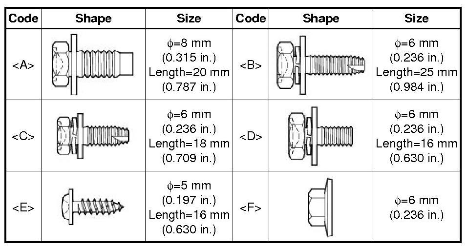 All bolts, screws and nuts relevant to installing and removing the instrument panel are shown along with their alphabet codes in the table below.