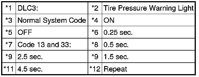(4) Read and record any DTCs from the tire pressure warning light on the combination meter. Refer to the illustration as examples of a normal system code and codes 13 and 33.