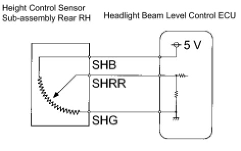 The height control sensor rear RH controls the resistance value based on changes vehicle height. The headlight beam level control ECU detects the changes in vehicle height from the transformed voltage. The headlight beam level control ECU outputs a constant voltage of 5 V to the SHB terminal of the height control sensor rear RH.