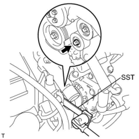 (b) Using SST, turn the belt tensioner counterclockwise and remove the bi-hexagon wrench.