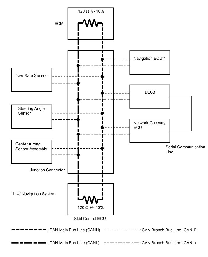 The skid control ECU detects and stores steering angle sensor and yaw rate sensor DTCs and performs DTC communication by receiving information from the steering angle sensor and yaw rate sensor.