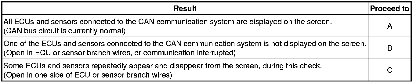 * ECUs related to a problem in the CAN bus will store DTCs to indicate communication malfunctions. The communication stop mode in the CAN bus can be determined by comparing the combination of DTCs that have been set. Refer to the DTC combination table for the CAN bus.