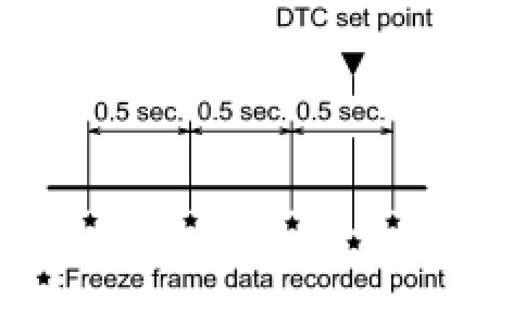 (b) The Techstream displays freeze frame data recorded at five different points: 1) 3 points before the DTC is set, 2) once when the DTC is set, and 3) once after the DTC is set. The data can be used to simulate the vehicle's condition around the time of the malfunction. The data may be helpful in determining the cause of a malfunction. It may also be helpful in determining whether a DTC is being caused by a temporary malfunction.