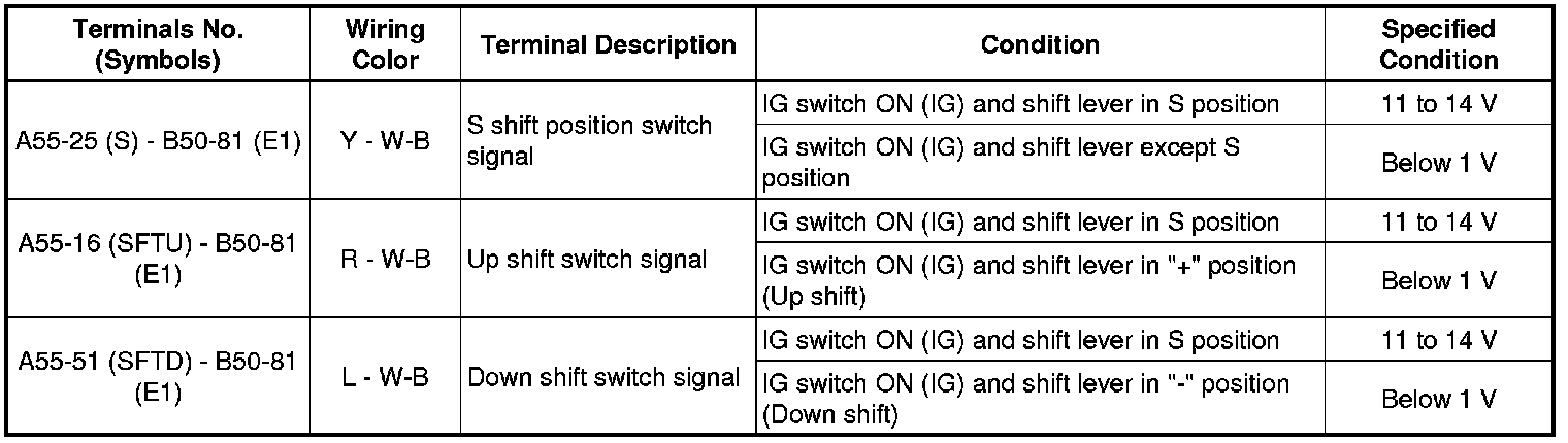 In the table, first follow the information under "Condition". Look under "Terminals No. (Symbols)" for the terminals to be inspected. The standard voltage between the terminals is shown under "Specified Condition".