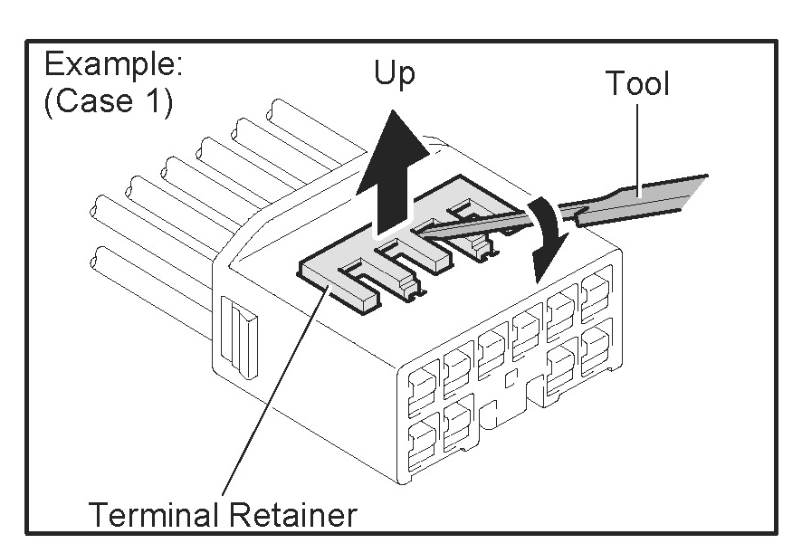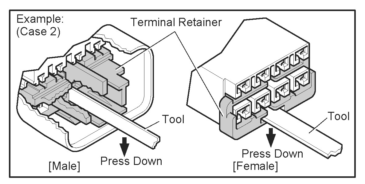 HINT: To remove the terminal from the connector, please construct and use the special tool or like object shown on the left.