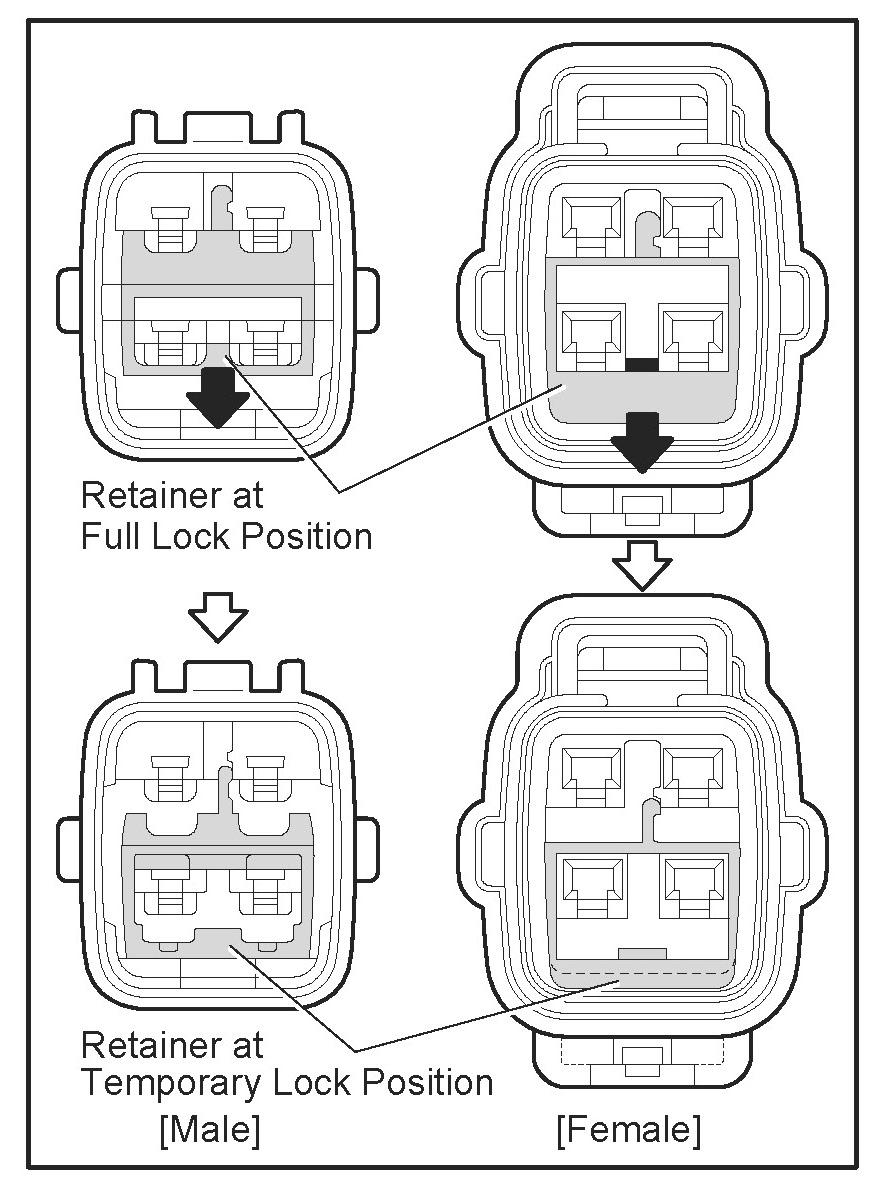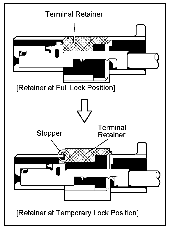 Insert the special tool into the terminal retainer access hole (triangle Mark) and pull the terminal retainer up to the temporary lock position.