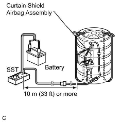 * When deploying the airbag, perform the operation at least 10 m (33 ft.) away from the curtain shield airbag assembly.