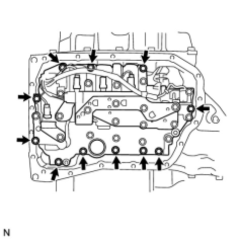 (a) Remove the 11 bolts and valve body assembly from the transaxle case.