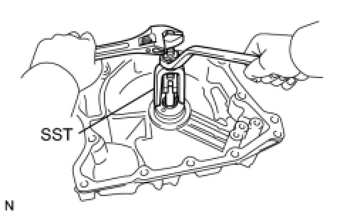 (a) Using a hexagon wrench (6 mm), remove the overflow plug from the automatic transaxle oil pan sub-assembly.
