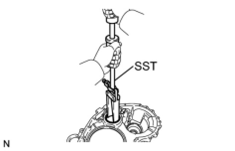 (a) Using SST, remove the counter driven gear front tapered roller bearing outer race and shim from the transaxle housing.